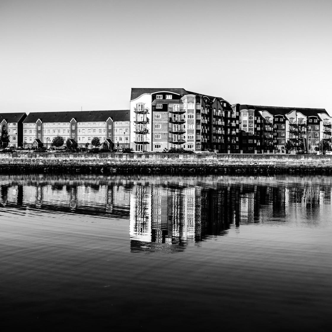 A marina tidal basin for yachts overlooked by buildings.