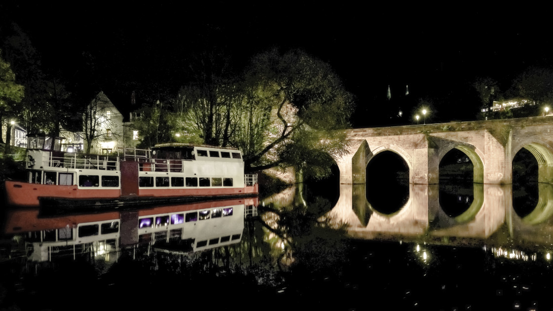 A floodlit Durham Bridge at night.