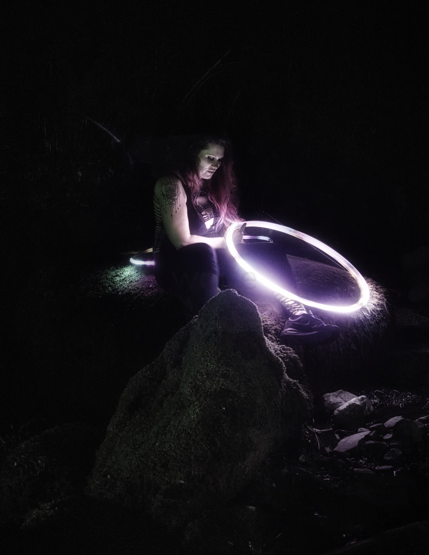 A figure holding an illuminated hoop.