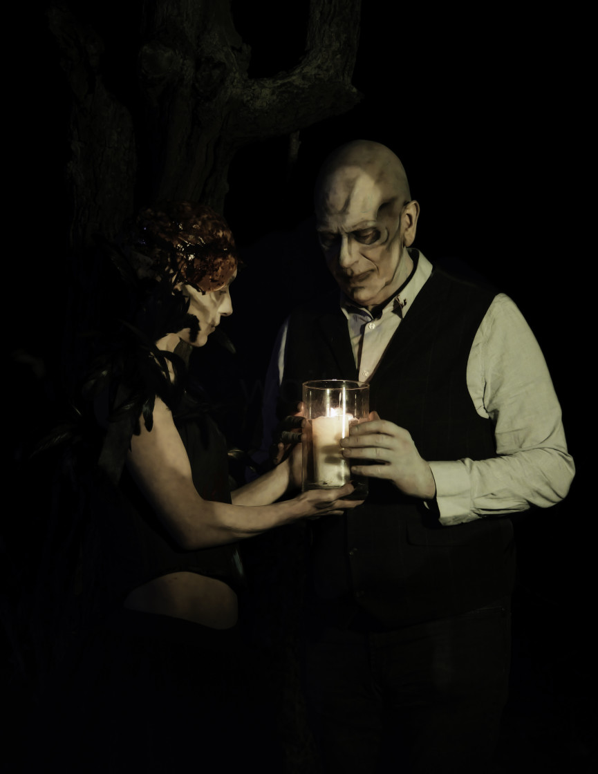 Halloween characters sharing candle light.