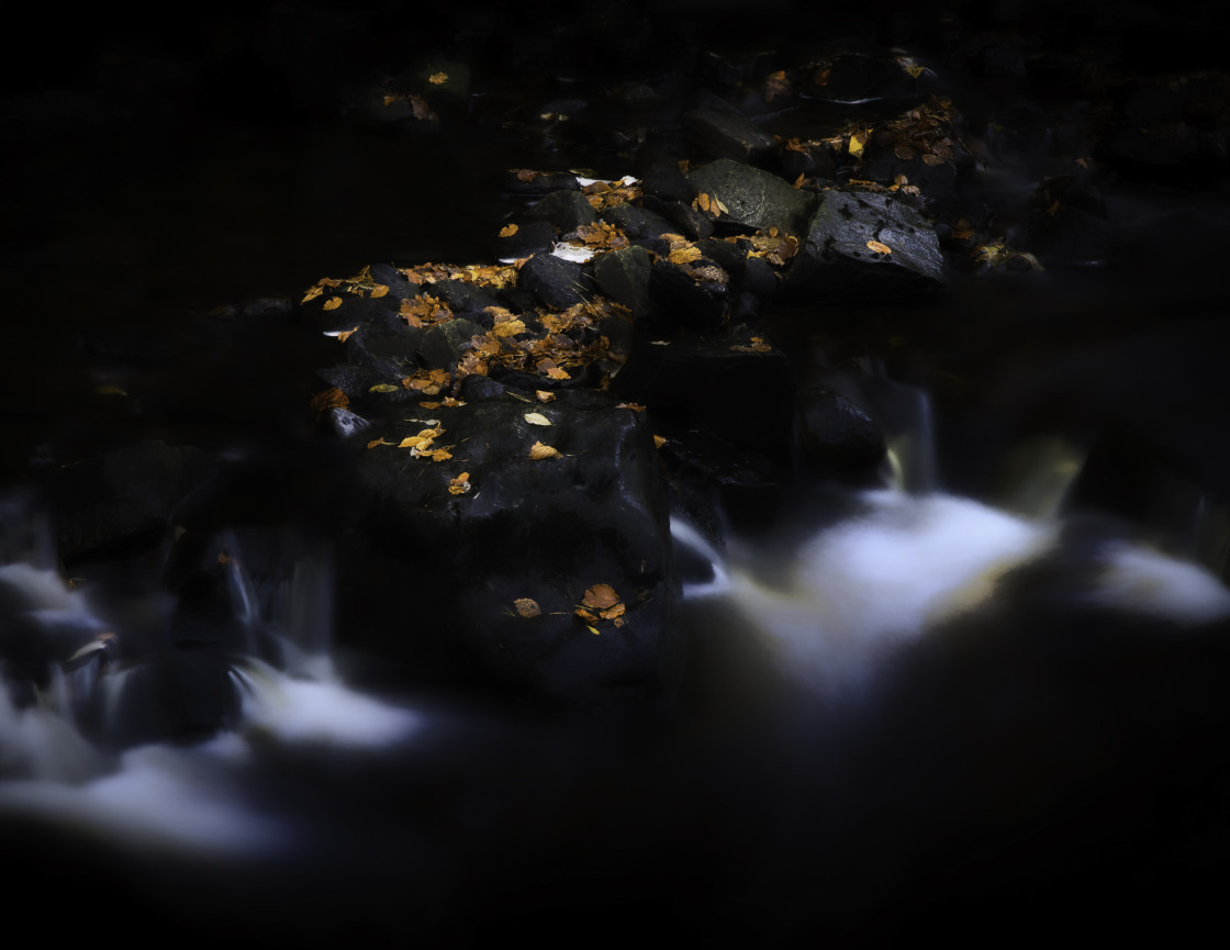 Evening woodland light falling on autumn leaves and flowing water.