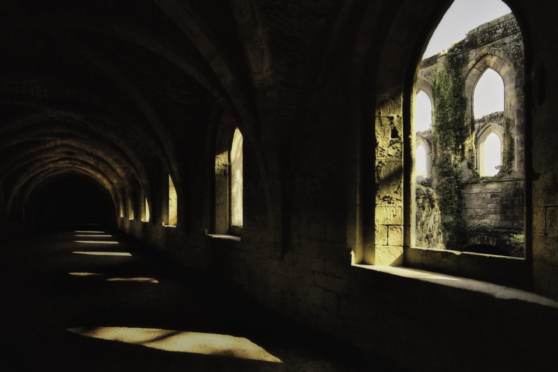 Sunlight shining through a ruined row of abbey cloister windows.